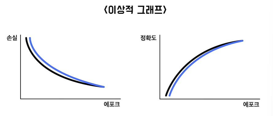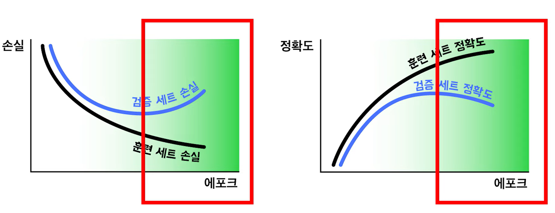 =>테스트 데이터셋에 대해서는 지속적으로 성능이 좋아지지 않지만 훈련 데이터셋에서는 아주 성능이 좋은 상태