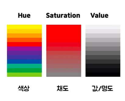RGB처럼 색상의 조합이 아니라 어떤 색상을 지정하고 채도 명도의 조합으로 표현되는 것이다. 그러므로 특정 색을 정의 내리기가 훨씬 쉽고 실제에 가깝다.